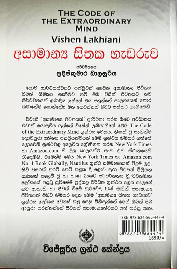 එවැනි ‘අසාමාන්ය ජීවිතයක්’ ප්රාර්ථනා කරන ඔබේ අවධානය වඩාත් යොමුවිය යුත්තේ විෂේන් ලකියානීන්ගේ මෙම The Code of the Extraordinary Mind ග්රන්ථය වෙතය. නිකුත් වූ සැනින්ම ලොවපුරා අතිශය ජනප්රියත්වයක් මෙම ග්රන්ථය හිමිකර ගත්තේ ලොවෙහි ග්රන්ථවල අලෙවිය ශ්රේණිගත කරන New York Times හා Amazon.com හි දිගු කාලයක්ම අංක එක ස්ථානයෙහි රැඳෙමිනි. එමෙන්ම මෙය New York Times හා Amazon.com No. 1 Book Globally, Nautilus ග්රන්ථ සම්මානයෙන් පිදුම් ලද සිව් වසරක් තරම් කෙටි කළක දී ලොව පුරා පිටපත් මිලියන ගණනක් අලෙව් වූ හා භාෂා 25කට පරිවර්තනය වූ වර්තමාන ලෝකයේ පළවූ සුවිශේෂී පුද්ගල වර්ධන ග්රන්ථය ලෙස සැලකේ. නව ආකෘති හා ජීවත් වීමේ ක්රම වේද 10ක් මඟින් අසාමාන්ය ජීවිතයක් ඔබට හිමිකර දෙන මෙම ‘අසාමන්ය සිතක හැඩරුව ග්රන්ථය ලෝකය වෙනස් කළ සෙසු මිනිසුන්ගේ මෙන් ඔබත් ඔබ ඇසුරු කරන්නන්ගේ ජීවිතත් අසාමාන්යත්වයට පත් කරනු ඇත.