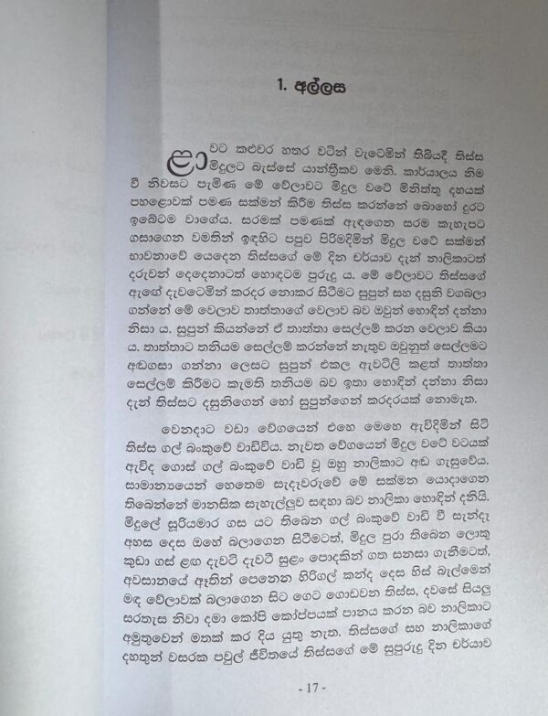 මටවත් වාහන මැනෙජර් එකත් එක්ක අළුයමටම පිටත්වෙන්න ගිහිල්ලාම වැඩකට යාමක් වුණා. නාඳුනන මැනෙජර් මිනිසෙක් අලුයමටම අල්ලසකට යන එකත් අමුතුයි. ඒත් ගමේ ගස් බෑමක වාහනේ යන්න වුන එක අමුතු අත්දැකීමක් වුණා. අල්ලසක් කියන්නෙ නියම අත්දැකීමක් විදියට මට අලුත්ම පණයක් වගේම ජීවිතේ එක අලුත් පදයක් වගේම හිස් දිනක් උනත් මට තේරුණා.