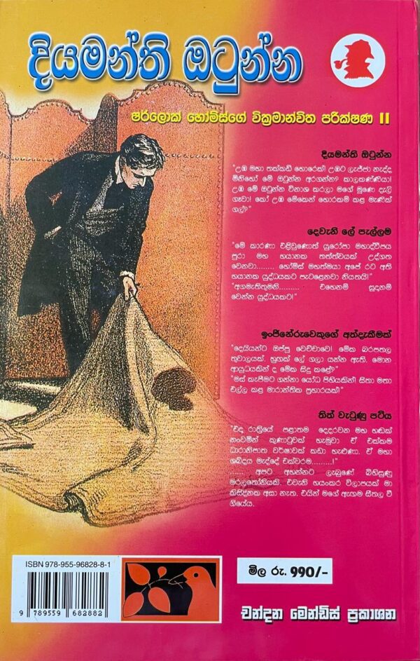 “මගේ මිත්රයා ඔහු හිඳගෙන සිටි හාන්සි පුටුවෙන් නැගිමේ අලස ආකාරයෙනි. පිටකබායේ සාක්කු දෙකට දෑත් රුවාගෙන ඔහු මගේ උරහිසට උඩින් වීථිය දෙස බැලුවේය. ඒ එක් පෙබරවාරි මාසයක් පැහැබර කාල ගුණයක් පැවැති දීප්තිමත් උදෑසනකි සිත සෘතුව නිසා කලින්දා රාත්රියේ ද තදින් හිම වැටීමක් පැවැතිණ. ඒ හිම උදෑසන හිරු එළියේ බැබළෙන අයුරු බැලීමට ආශා උපදවන දසුනක් විය. බේකර් වීථියේ මැදට වන්නට, හිම දුඹුරු පැහැයට හැරී, නගුලකින් හාරා දමුවාක් මෙන් දිස්විය. ඒ අශ්ව කරත්ත ගමනාගමනය නිසයි. පාරේ ලිස්සන සුලු ස්වභාවය නිසා, පයින් ගියේ ඉඳහිට කෙනෙක් පමණි. ඇත්තෙන්ම මෙට්රොපොලිටන් දුම්රිය පොළ දෙසින් ඇවිද ආවේ මා කලින් සඳහන් කළ පුද්ගලයා පමණි.”