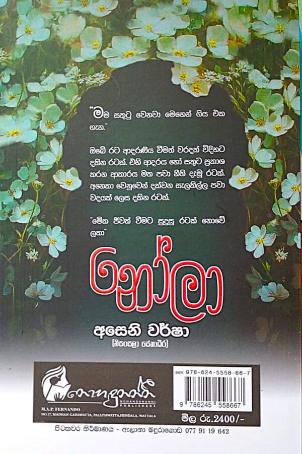 Home love Story නෝලා – Nola නෝලා – Nolaරු2,400.00 Original price was: රු2,400.00.රු1,920.00Current price is: රු1,920.00. Author: Nisansala Senadeera Edition: 2025 Language: Sinhala Publisher: Nohadunanni Publishers නෝලා - Nola quantity Add to basket Ask a Question Categories: love Story, Novels, Short Stories, Short Story Tags: Nisansala Senadeera, Nola, Noola, නෝලා Aseni warsha Nohadunanni publisher Description More Offers Store Policies Enquiries “මම සතුටු වෙනවා මෙහෙන් ගිය එක ගැන. ඔබේ රට ආදරණීය වීමත් වරදක් විදිහට දකින රටක්. එහි ආදරය හෝ සතුට ප්රකාශ කරන ආකාරය මත පවා නීති දැමූ රටක්. අනෙකා වෙනුවෙන් දක්වන සැලකිල්ල පවා වදයක් ලෙස දකින රටක් No more offers for this product! General Enquiries There are no enquiries yet. Related products up to - 20% මාණික්කාවත | Manikkawatha රු900.00 Original price was: රු900.00.රු720.00Current price is: රු720.00. Novels, Short StoriesAdd to basket up to - 20% අපොයියාව – Apoiyawa රු700.00 Original price was: රු700.00.රු560.00Current price is: රු560.00. NovelsAdd to basket up to - 20% Victoria Holt My Enemy the Queen – රැජින මගේ පසමිතුරි රු1,800.00 Original price was: රු1,800.00.රු1,440.00Current price is: රු1,440.00. Novels, TranslateAdd to basket up to - 15% දෙවෙනි ගැහැනිය – Deveni Gahaniya රු1,500.00 Original price was: රු1,500.00.රු1,275.00Current price is: රු1,275.00. Novels, RomanceAdd to basket