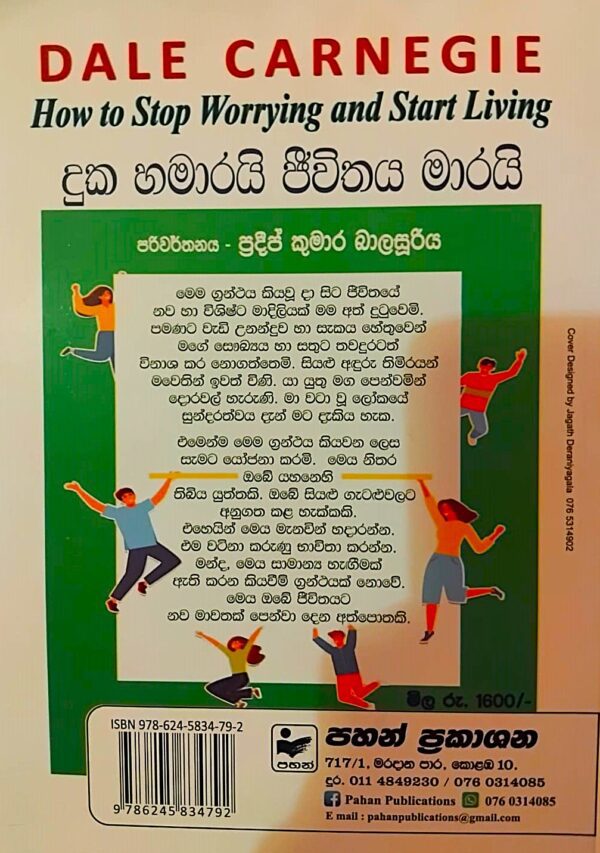 ඩේල් කාර්නේගී විසින් රචිත ධනාත්මක චින්තන ග්‍රන්ථ බොහෝ අපූරු ය. මෙයද එවැනි අපූරු ග්‍රන්ථයකි. කණගාටුවීම ගැන අපට ඇත්තේ අවම තක්සේරුවකි. එහෙයින් එය ගැන නොසිතා අවශ්‍ය හා අනවශ්‍ය සියලු තැන්හී අපි කණගාටුවන්නෙමු. නමුත් කණගාටුවීම හා එයින් උපදින මානසිත කායික වෙහෙස අප මරණයට පත් කරවන තරම් විනාශකාරී වූවකි. මෙම ග්‍රන්ථය කියවීමෙන් ඔබ මැනවින්ම වටහාගන්නේ කණගාටුවීම සම්බන්ධයෙන් නව දැක්මක්ද සමගිනි. මන්ද කණගාටුවීම සරල අත්දැකීමක් යැයි සිතන අපට එහි බරපතලකම මෙම ග්‍රන්ථය හඳුනාගත හැකිවන්නේ එය මර්දනය කරන ක්‍රමවේදද සමගිනි.
